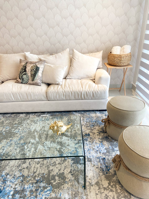 Tapiz, tapete, taburetes y mesa de centro